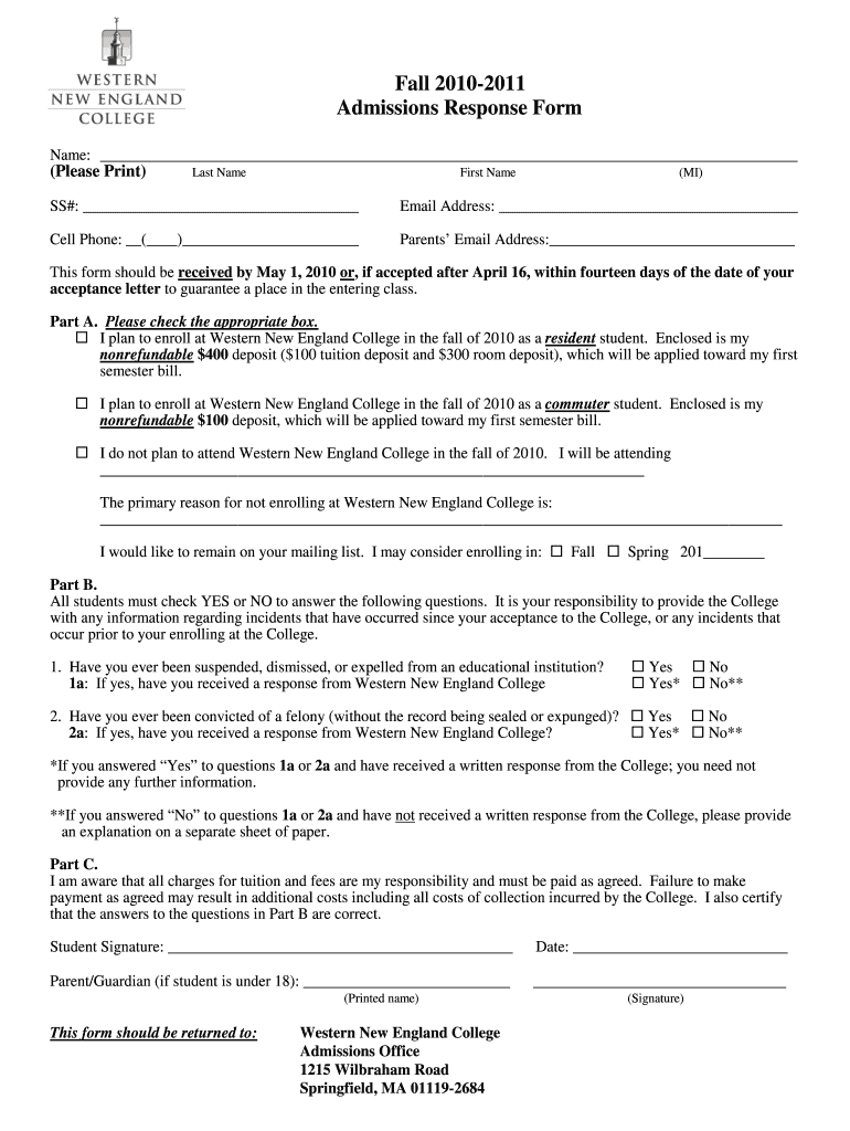 The Admissions Response Form is intended for students who have been accepted to Western New England College and need to confirm their enrollment for the upcoming fall semester.