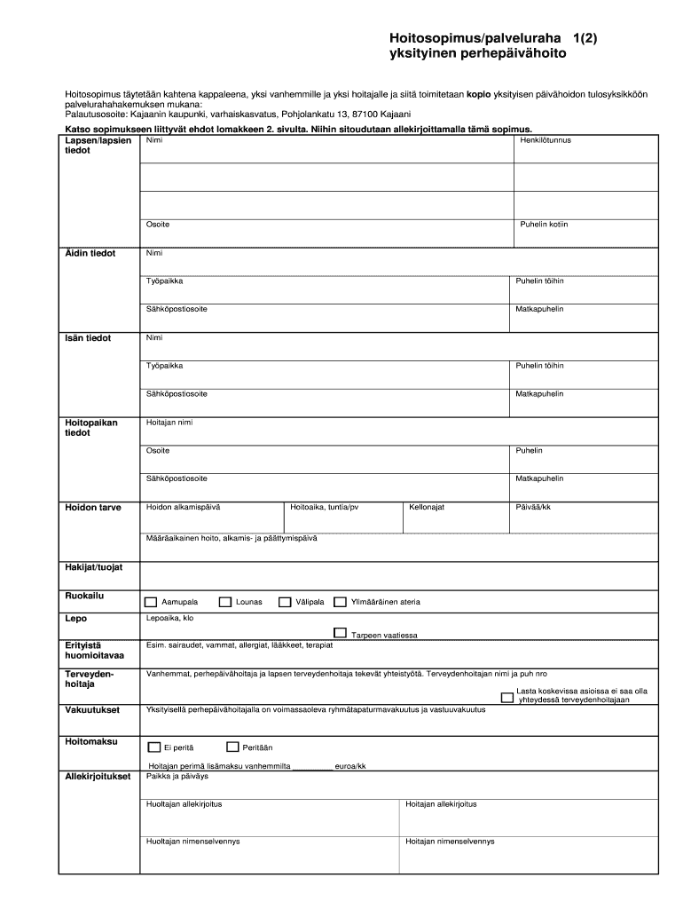 Who needs hoitosopimus palveluraha yksityinen perhepaivahoito: