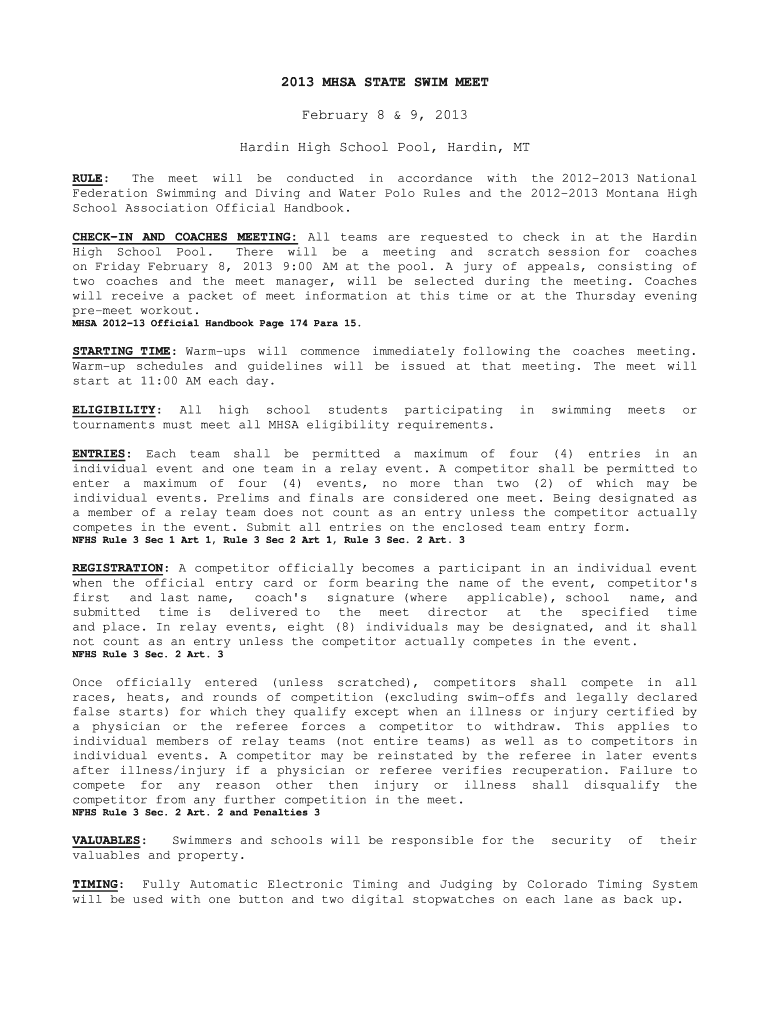 How to fill out 2013 MHSA STATE SWIM MEET