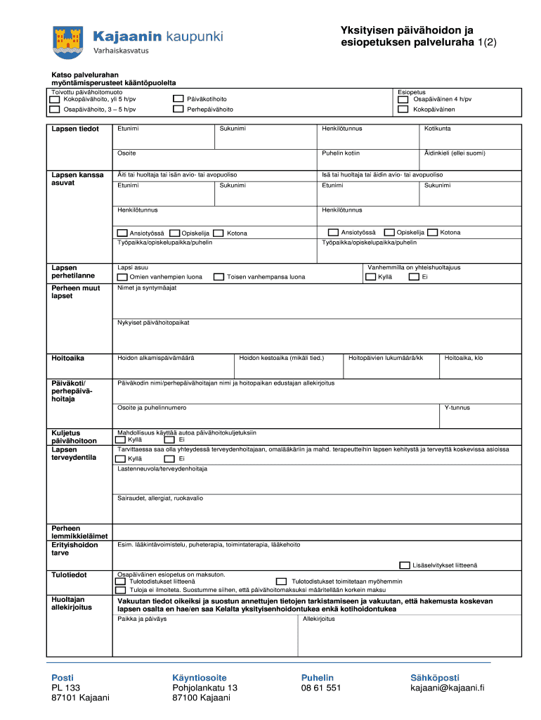 Get the free Yksityisen paivahoidon ja esiopetuksen palveluraha - kajaani