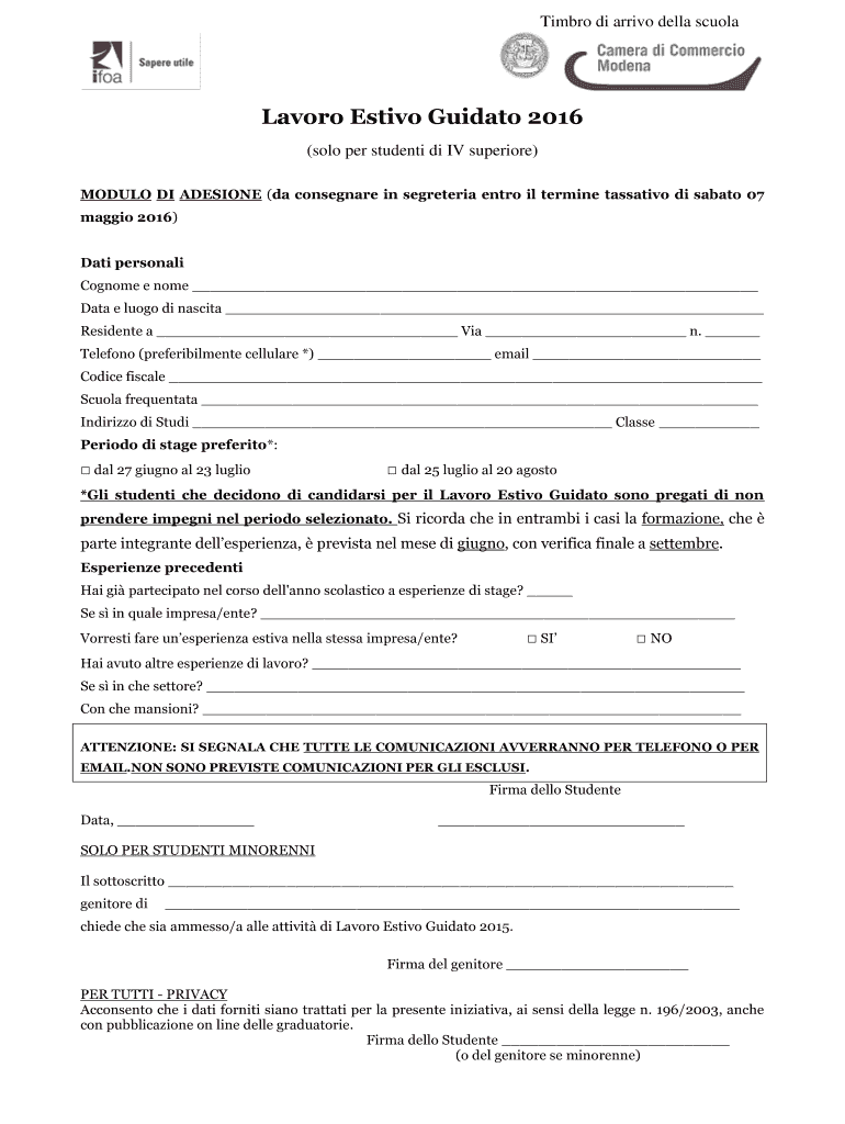 Timbre DI arrives in Della Sculley Favor Festive Guido 2016 (solo per students DI IV superior) MODULO DI ADHESION (the consigned in Secretariat entr oil termini causative DI Sabbath 07 Maggie 2016)