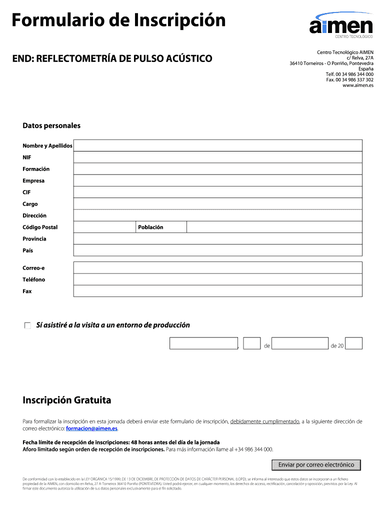 Formulation de Inscripcin CENTR Tecnolgico AIMED c/ Reva, 27A 36410 Tornados O Portion, Pontevedra ESAA Self. 00 34 986 344 000 Fax. 00 34 986 337 302 www.aimen.es END: REFLECTOMETRA DE PULSE ACETIC