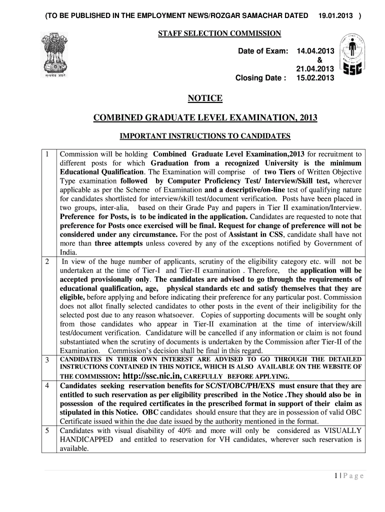 (TO BE PUBLISHED IN THE EMPLOYMENT NEWS/ROGER SALAZAR DATED 19.01.2013) STAFF SELECTION COMMISSION Date of Exam: Closing Date : 14.04.2013 & 21.04.2013 15.02.2013 NOTICE COMBINED GRADUATE LEVEL EXAMINATION,