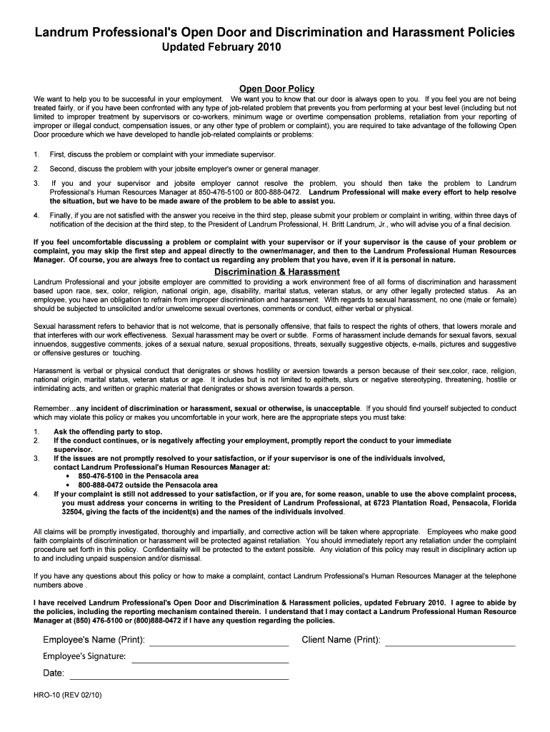 Land rum Professional's Open Door and Discrimination and Harassment Policies Updated February 2010 Open Door Policy We want to help you to be successful in your employment. We want you to know that