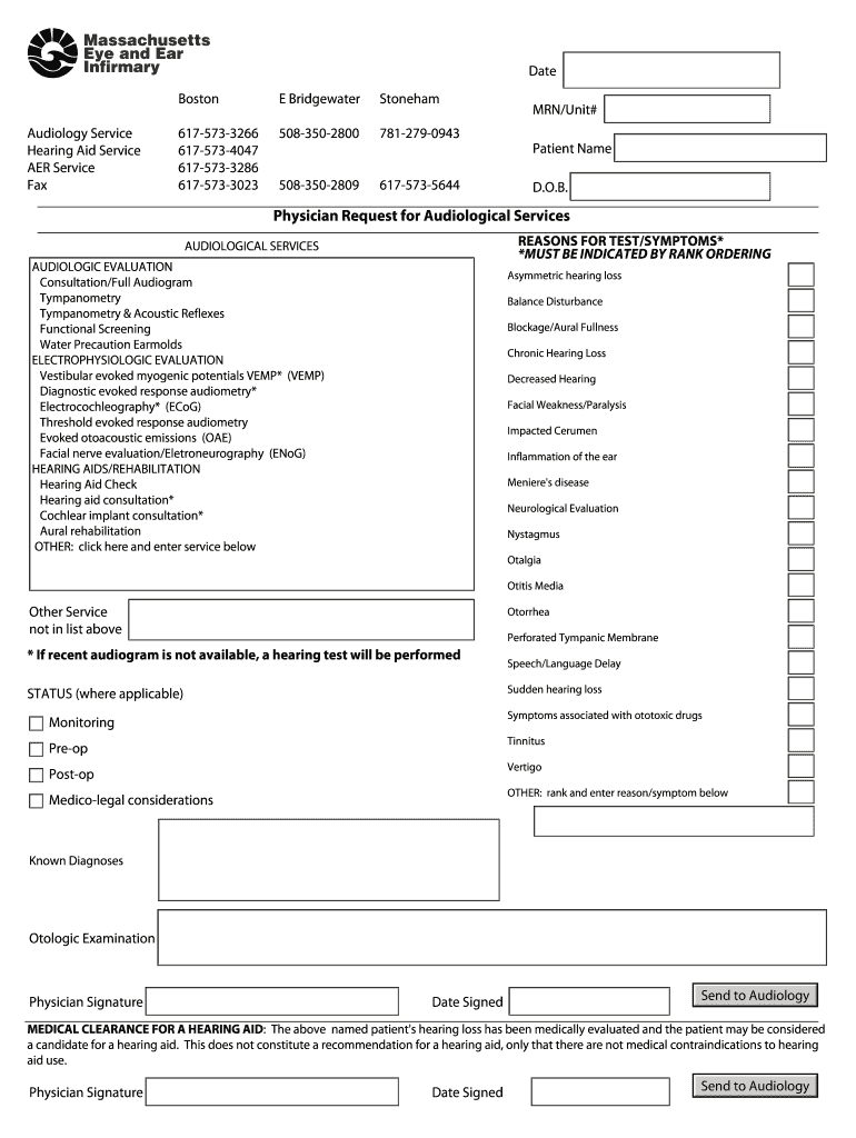 This document serves as a request for various audiological services including evaluations and hearing aid consultations. It includes sections for patient information, reasons for testing, and physician
