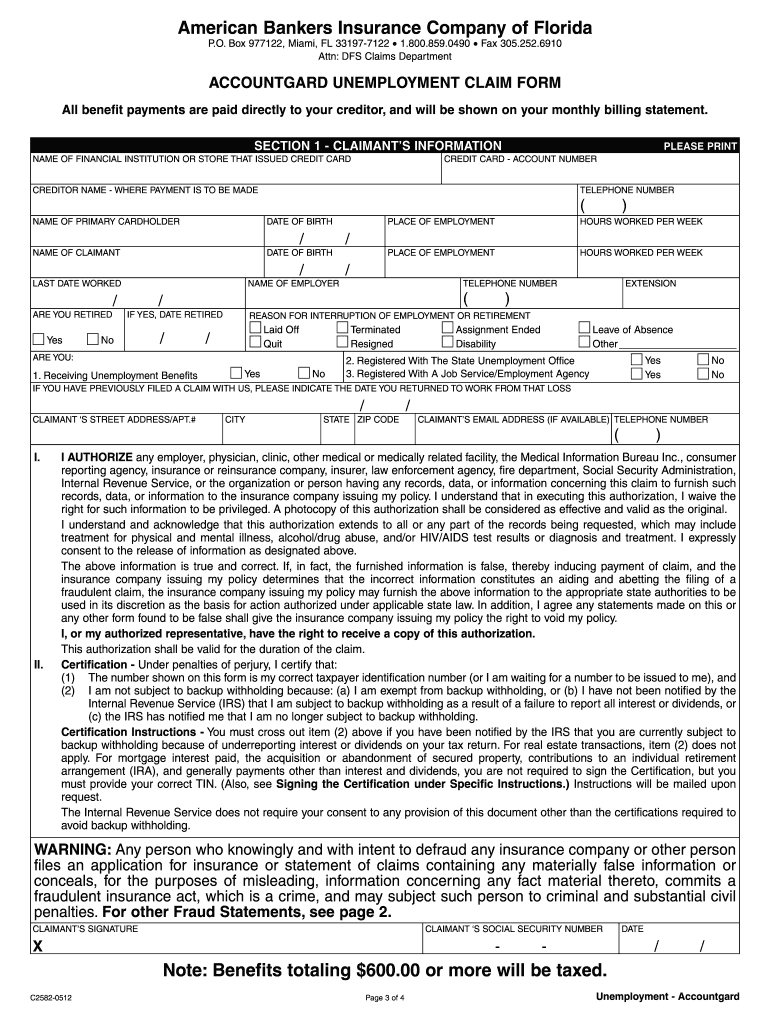 American Bankers Insurance Company of Florida P.O. Box 977122, Miami, FL 331977122 1.800.859.0490 Attn: DFS Claims Department Fax 305.252.6910 ACCOUNTED UNEMPLOYMENT CLAIM FORM IMPORTANT NOTICE PLEASE