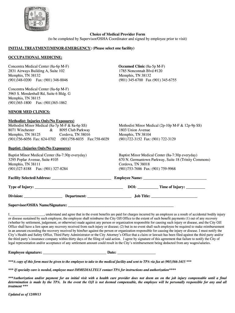 Choice of Medical Provider Form (to be completed by Supervisor/OSHA Coordinator and signed by employee prior to visit) INITIAL TREATMENT/MINOREMERGENCY: (Please select one facility) OCCUPATIONAL MEDICINE: