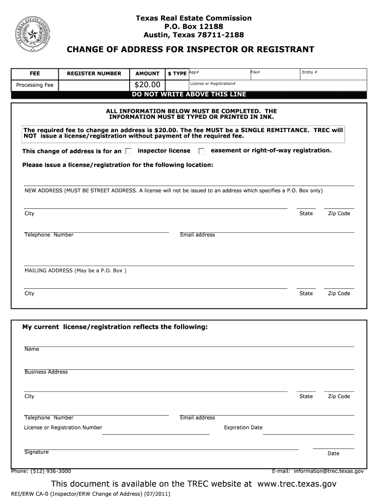 Print Form Texas Real Estate Commission P.O. Box 12188 Austin, Texas 787112188 CHANGE OF ADDRESS FOR INSPECTOR OR REGISTRANT FEE REGISTER NUMBER AMOUNT $ TYPE $20.00 Processing Fee App# File# Entity