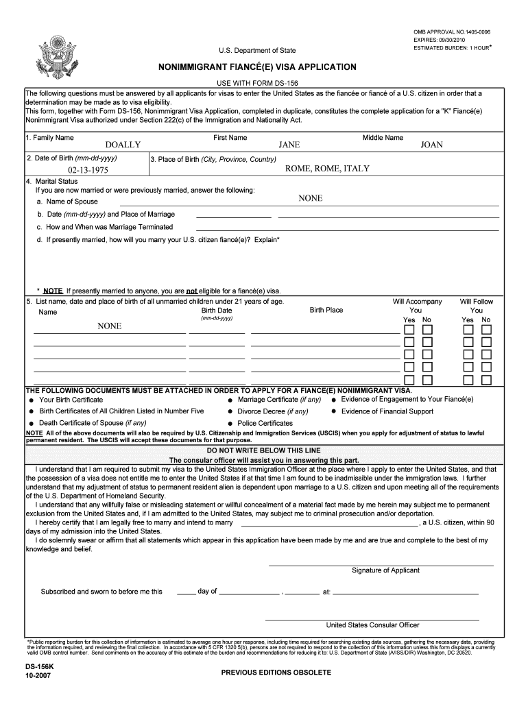 Examples and Samples of a Completed Fiancé(e) Visa Application Form DS-156K