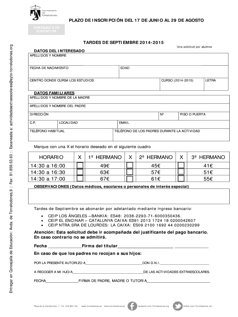 PLAZA DE INSCRIPTION DEL 17 DE JUNIOR AL 29 DE AGO STO Entreat en Conceal de Education: Ada. De Torrelodones,9 :: Fax: 91.859.53.63 :: Canada a: actividadesextraescolares aytotorrelodones.org CONCEAL