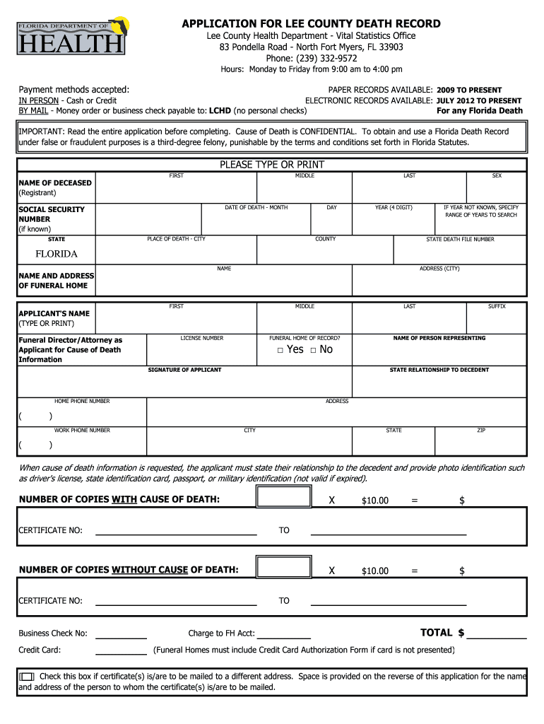 Get the free APPLICATION FOR LEE COUNTY DEATH RECORD