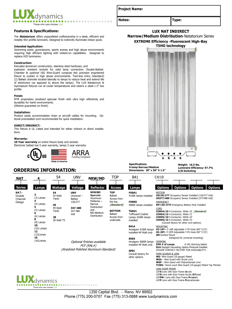 Project Name: Notes: Features & Specifications: Type: LUX NAT INDIRECT Narrow/Medium DistributionNatatorium Series The Sanatorium offers unparalleled craftsmanship in a sleek, efficient and notably