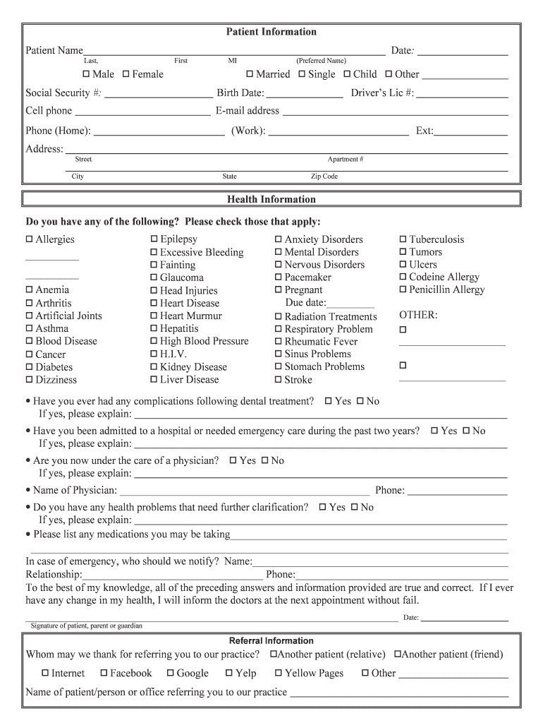 Patient Information Patient Name Last, First Male MI Female Married Social Security #: Birth Date: Cell phone E-mail address Phone (Home): Address: Date: (Preferred Name) Single Child Other Driver