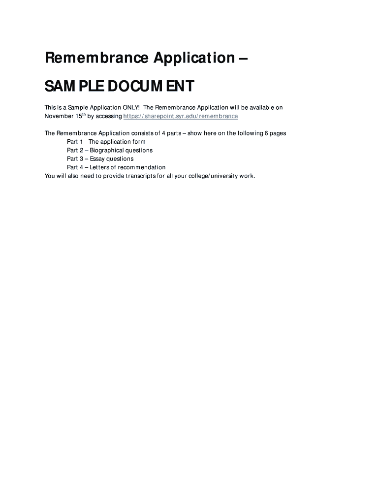 Remembrance Application SAMPLE DOCUMENT This is a Sample Application ONLY! The Remembrance Application will be available on November 15th by accessing https://sharepoint.syr.edu/remembrance The Remembrance