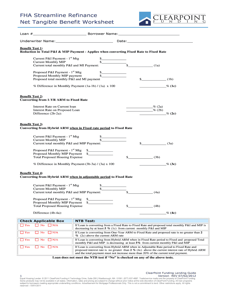 The FHA Streamline Refinance Net Tangible Benefit Worksheet is a financial document used by lenders to assess the benefits of refinancing an FHA loan.