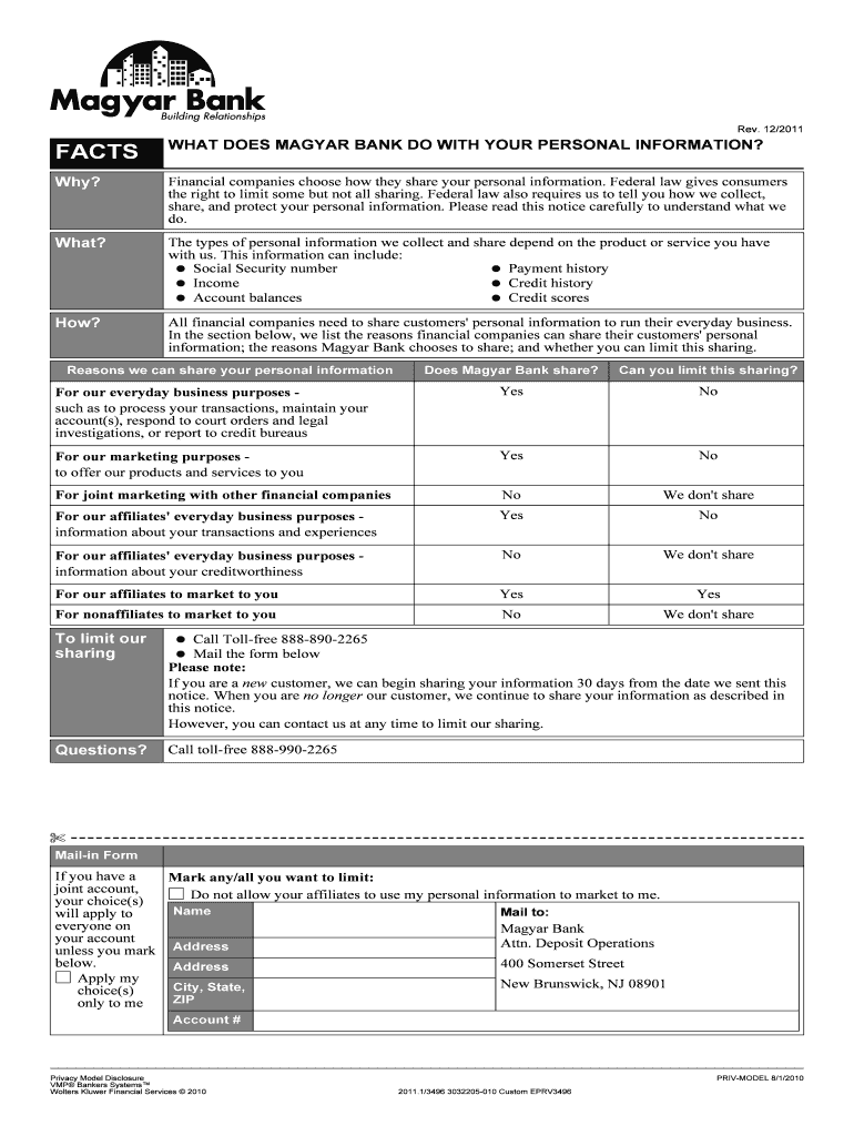 The Magyar Bank Privacy Notice is a privacy policy document used by Magyar Bank to inform customers about the collection, sharing, and protection of their personal information.