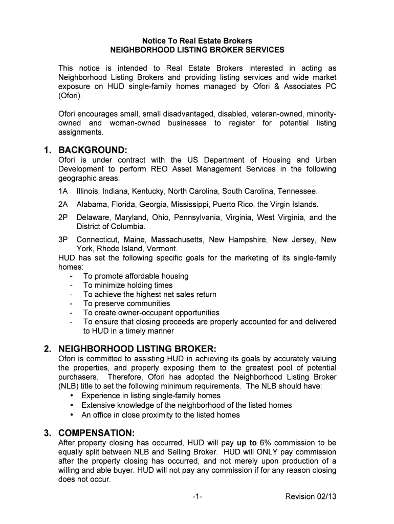 This notice aims to inform Real Estate Brokers about the requirements and responsibilities of acting as Neighborhood Listing Brokers for HUD single-family homes managed by Ofori & Associates PC, promoting