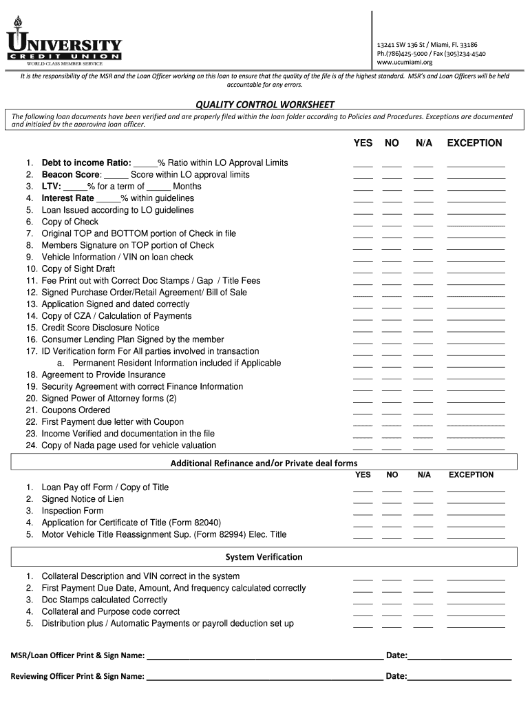 The Quality Control Worksheet is a business document used by MSR and Loan Officers to verify the quality and completeness of loan documents.