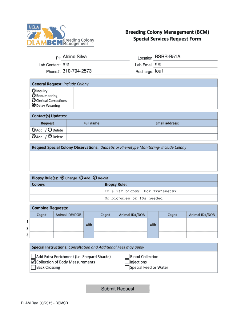 Breeding Colony Management (BCM) Special Services Request Form Albino Silva Lab Contact: me Phone#: 3107942573 BSRBB51A Lab Email: me Recharge: Iou1 PI: Location: General Request: Include Colony Inquiry