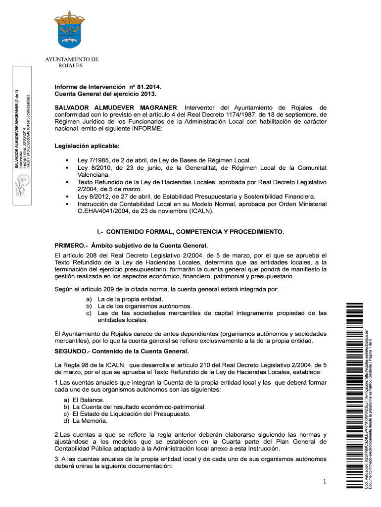 Informed DE Intervention n 81.2014. Cent General Del Jericho 2013. SALVADOR ALMUDEVER MARINER, Intervention Del Ayuntamiento de Rojales, DE conforming con lo proviso en el Arturo 4 Del Real Secret