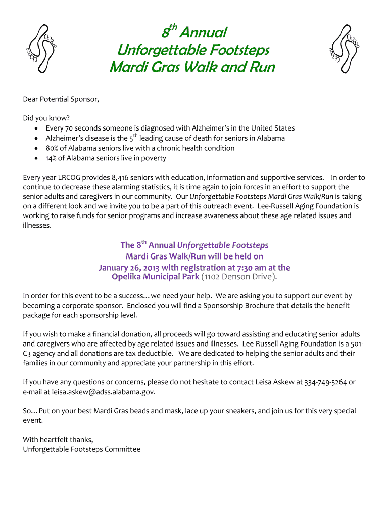 This document is an invitation for potential sponsors to support the 8th Annual Unforgettable Footsteps Mardi Gras Walk/Run, aimed at raising funds for senior programs and increasing awareness about