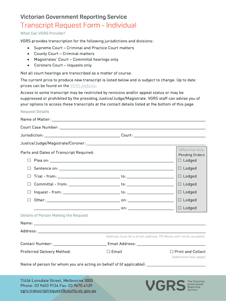 Victorian Government Reporting Service Transcript Request Form Individual What Can GRS Provide? GRS provides transcription for the following jurisdictions and divisions: Supreme Court Criminal and