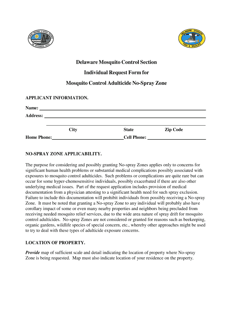 Delaware Mosquito Control Section Individual Request Form for Mosquito Control Adulterize No Spray Zone APPLICANT INFORMATION. Name: Address: City Home Phone: State Zip Code Cell Phone: SPRAY ZONE