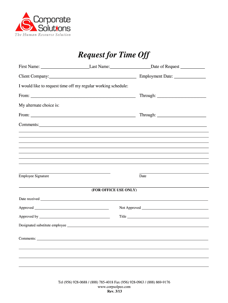 The Request for Time Off Form is an employment document used by employees to formally request time off from their work schedule.
