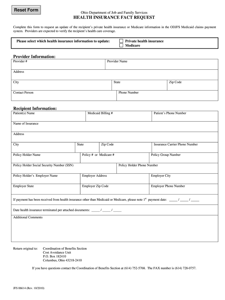 The Ohio Health Insurance Fact Request Form is a health insurance claim document used by healthcare providers in Ohio to update private health insurance or Medicare information for Medicaid claims.