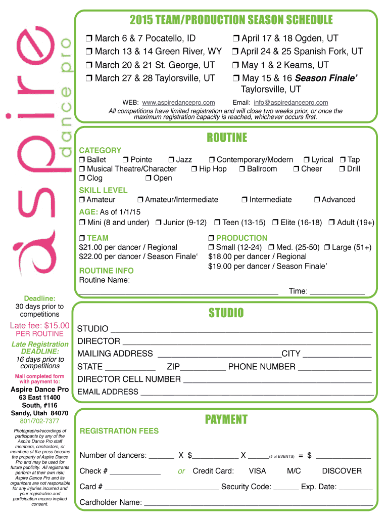2015 TEAM/PRODUCTION SEASON SCHEDULE March 6 & 7 Pocatello, ID March 13 & 14 Green River, WY March 20 & 21 St. George, UT March 27 & 28 Taylorsville, UT! ! ! ! ! ! ! ! April 17 & 18 Ogden, UT April