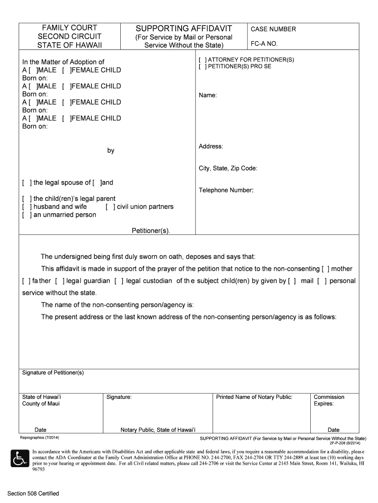 FAMILY COURT SECOND CIRCUIT STATE OF HAWAII SUPPORTING AFFIDAVIT (For Service by Mail or Personal Service Without the State) CASE NUMBER FCA NO. ATTORNEY FOR PETITIONER(S) PETITIONER(S) PRO SE In