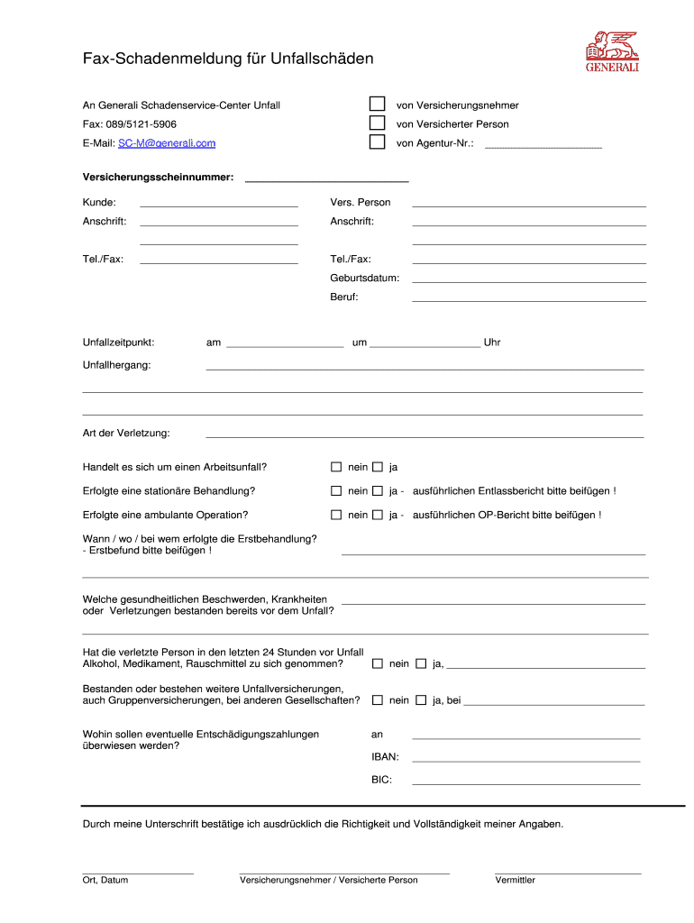 FaxSchadenmeldung for Unfallschden An Generali SchadenserviceCenter Fall von Versicherungsnehmer Fax: 089/51215906 on Versicherter Person Email: SCM generali.com on Adventurer.: Versicherungsscheinnummer:
