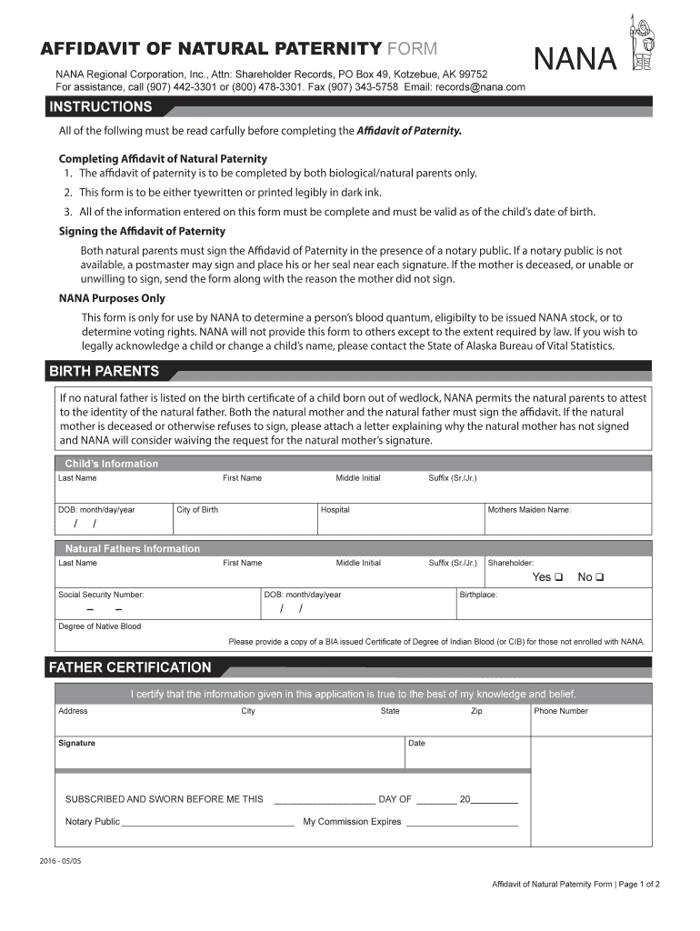 AFFIDAVIT OF NATURAL PATERNITY FORM NANA Regional Corporation, Inc., Attn: Shareholder Records, PO Box 49, Kotzebue, AK 99752 For assistance, call (907) 4423301 or (800) 4783301. Fax (907) 3435758