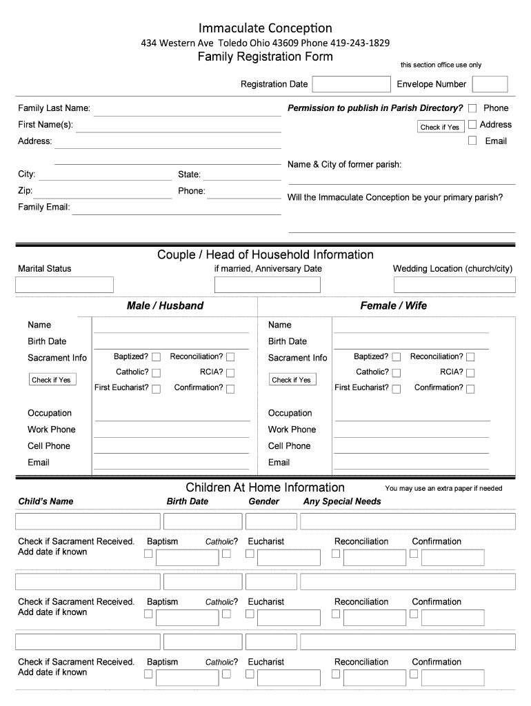Immaculate Conception 434 Western Ave Toledo Ohio 43609 Phone 4192431829 Family Registration Form this section office use only Registration Date Family Last Name: Envelope Number Permission to publish