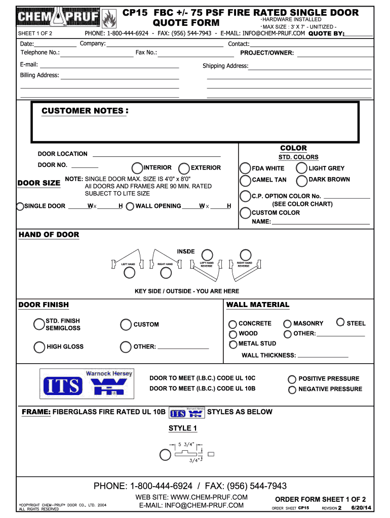 CP15 BBC +/ 75 PSF FIRE RATED SINGLE DOOR HARDWARE INSTALLED QUOTE FORM MAX SIZE : 3 × 7 UNITIZED SHEET 1 OF 2 : CP15 2 6/20/14 CP15 BBC +/ 75 PSF FIRE RATED SINGLE DOOR QUOTE FORM HARDWARE INSTALLED