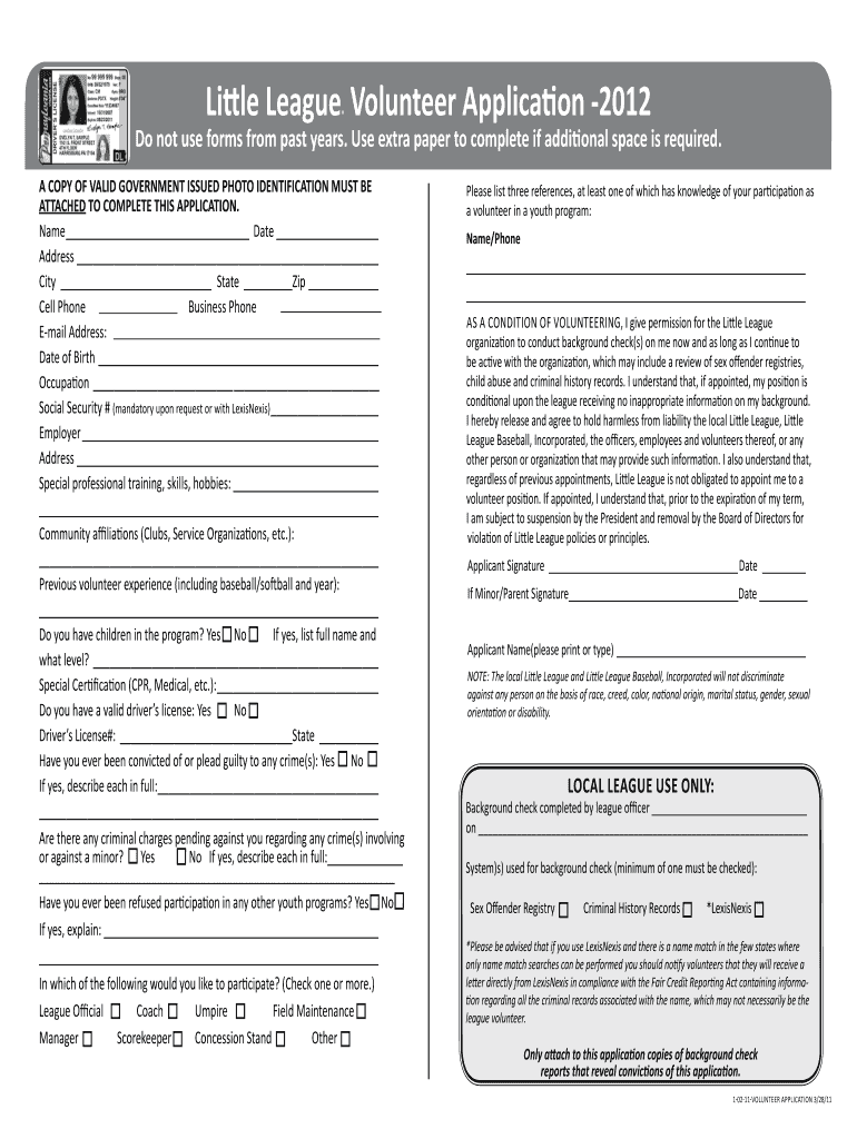 Little League Volunteer Application 2012 Do not use forms from past years. Use extra paper to complete if additional space is required. A COPY OF VALID GOVERNMENT ISSUED PHOTO IDENTIFICATION MUST