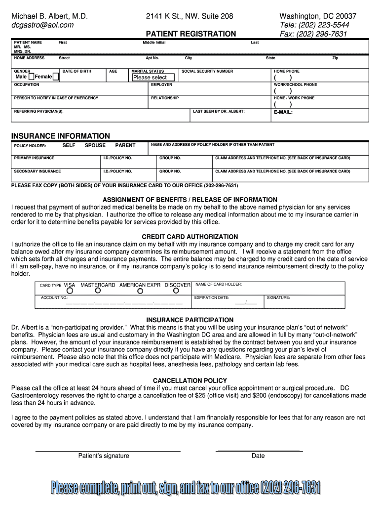 Michael B. Albert, M.D. Castro aol.com Clear Form Washington, DC 20037 Tell: (202) 2235544 Fax: (202) 2967631 2141 K St., NW. Suite 208 PATIENT REGISTRATION PATIENT NAME MR. MS. MRS. DR. First HOME