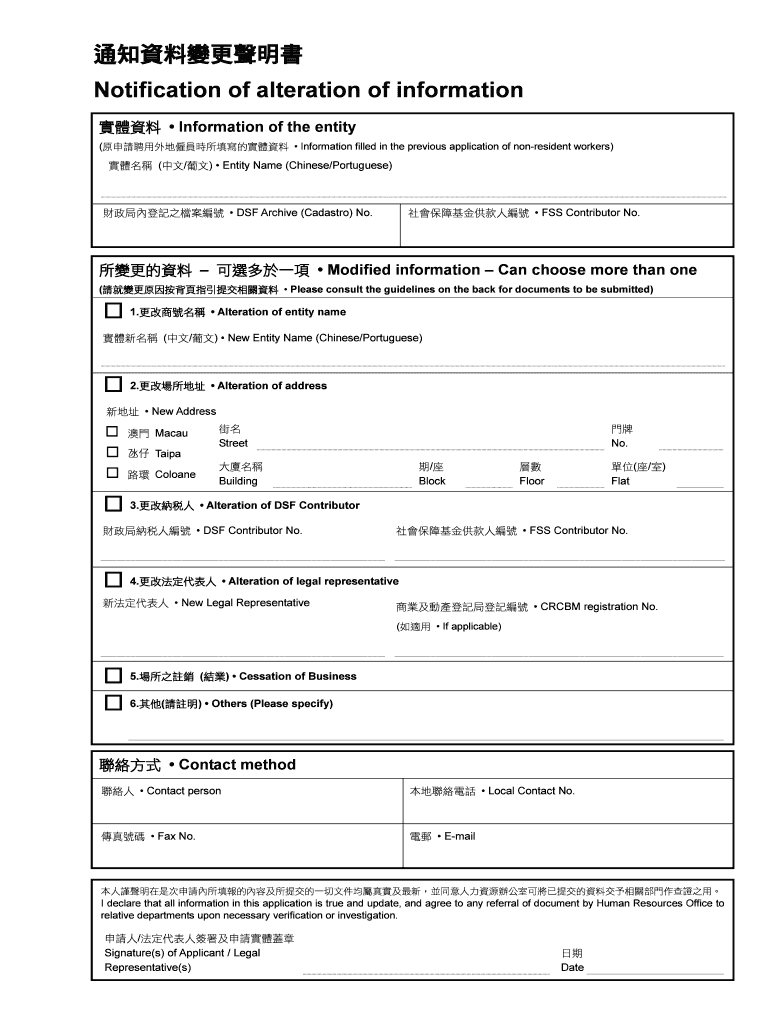 Notification of alteration of information of the entity (Information filled in the previous application of nonresident workers) (/) Entity Name (Chinese/Portuguese) DSF Archive (Castro) No. FSS Contributor