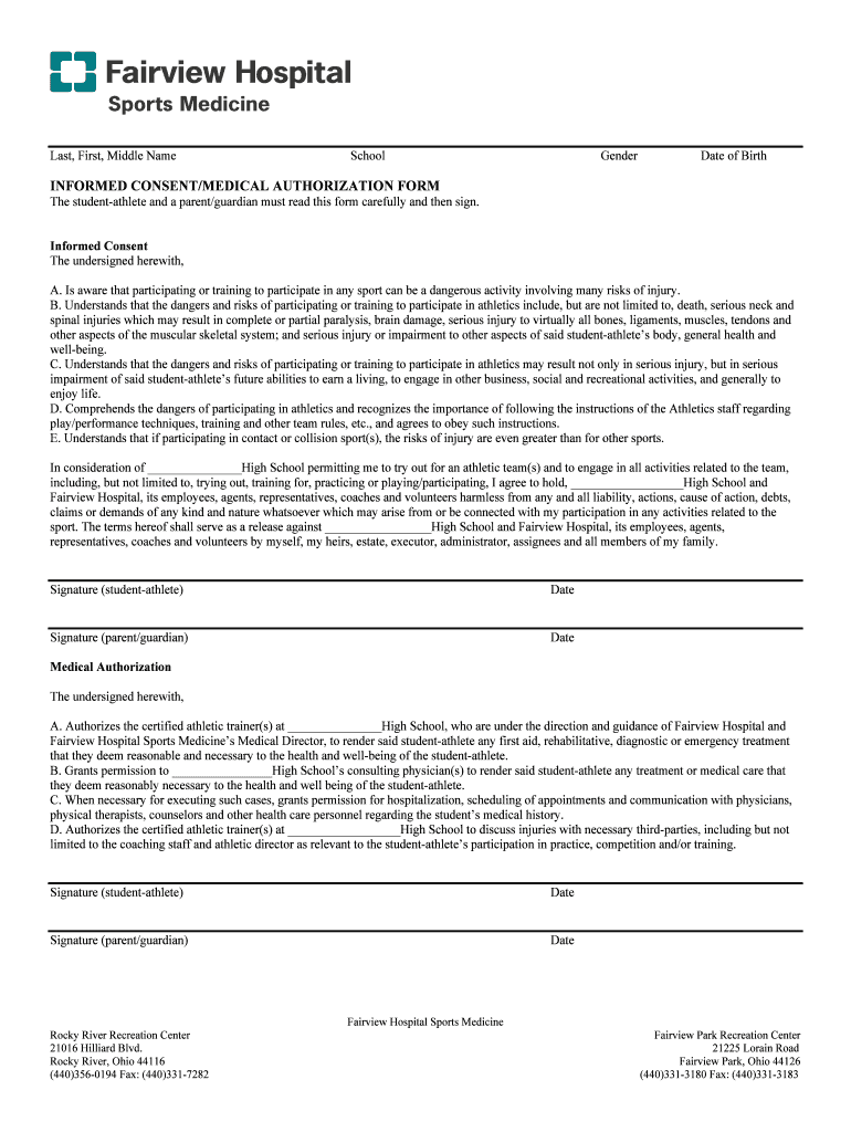 The Informed Consent/Medical Authorization Form is a medical consent document used by student-athletes and their parents/guardians to acknowledge sports risks and authorize medical treatment.