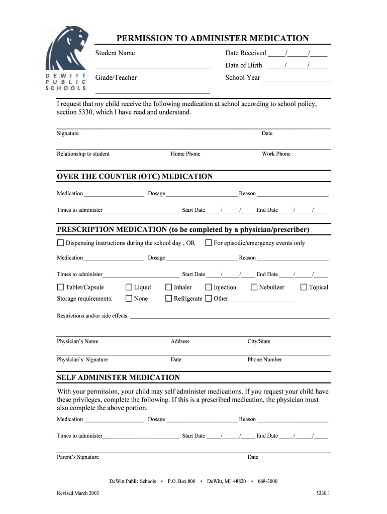 The form requires signatures from both the parent or guardian and, if applicable, a physician to authorize the administration of medication.