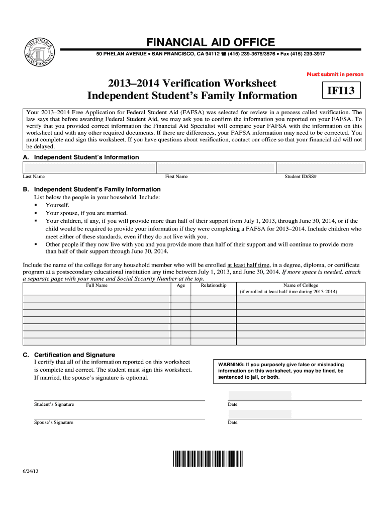 Independent students applying for federal financial aid are eligible to submit the 2013-2014 Verification Worksheet. They must provide accurate information regarding their financial situations and that of their household.