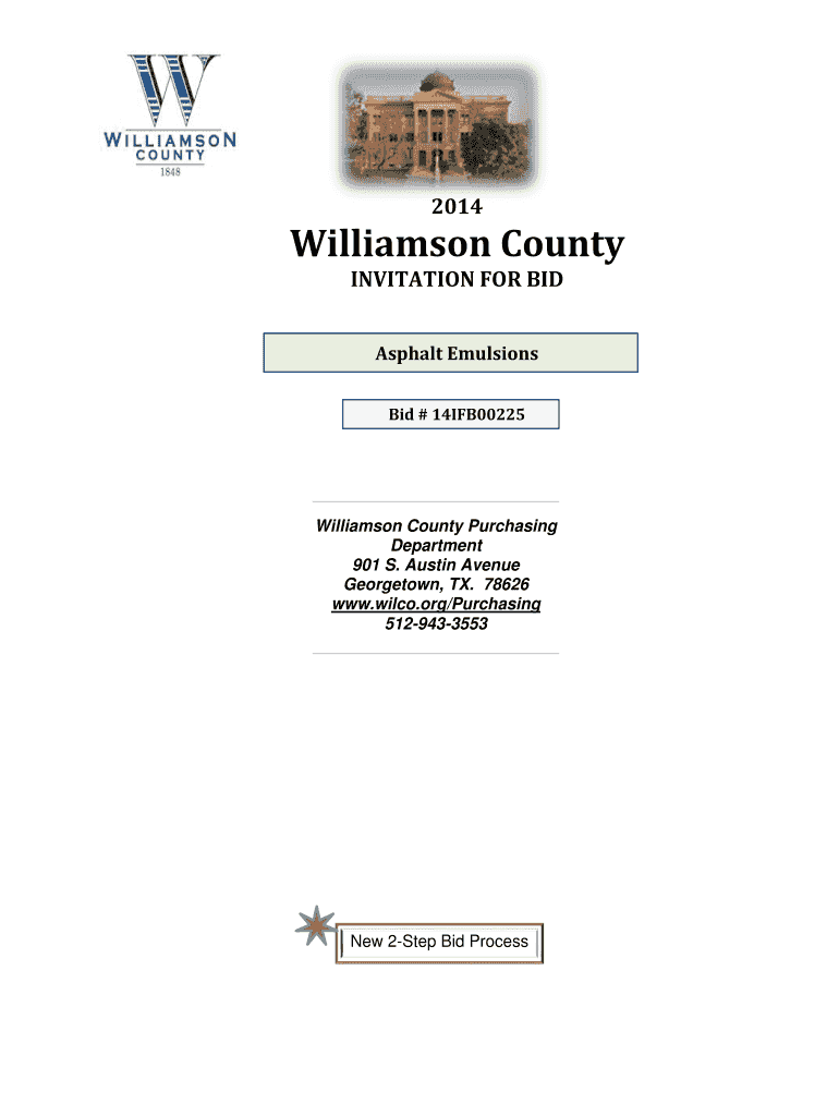 2014 Williamson County INVITATION FOR BID Asphalt Emulsions Bid # 14IFB00225 13WCIFB00024 Williamson County Purchasing Department 901 S. Austin Avenue Georgetown, TX. 78626 www.wilco.org/Purchasing
