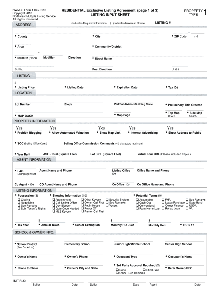 NAMES Form 1 Rev. 5/10 Copyright 2010 Northwest Multiple Listing Service All Rights Reserved RESIDENTIAL Exclusive Listing Agreement (page 1 of 3) LISTING INPUT SHEET Indicates Required information