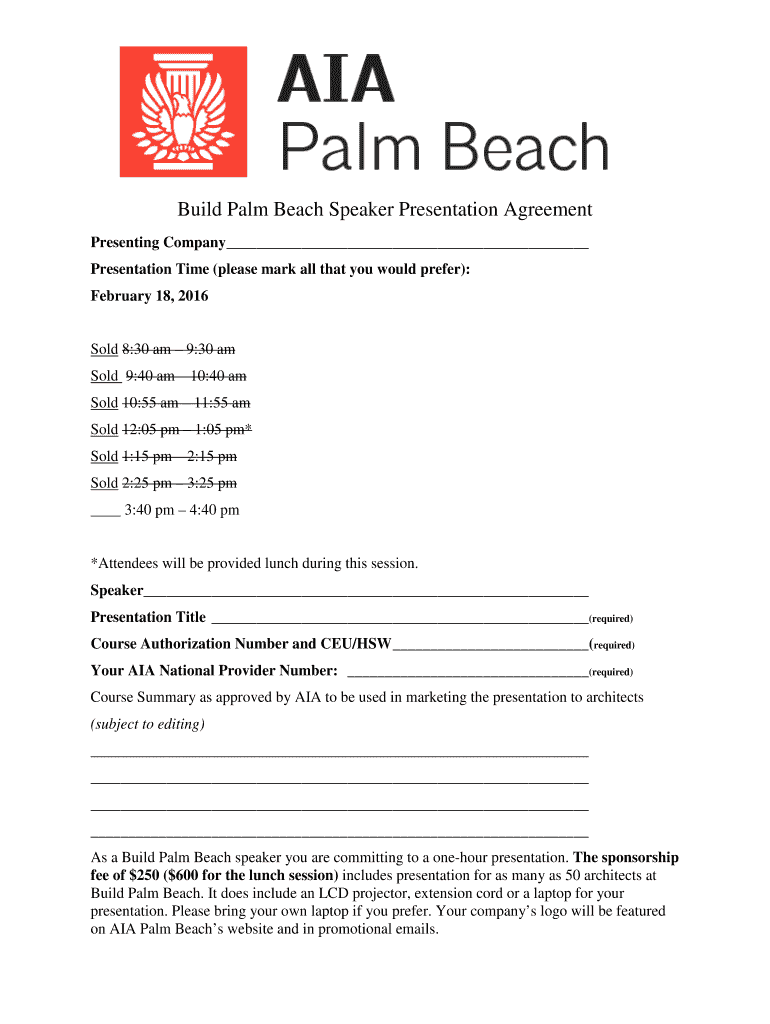 Get the free Build Palm Beach Speaker Presentation Agreement Presenting Company Presentation Time...