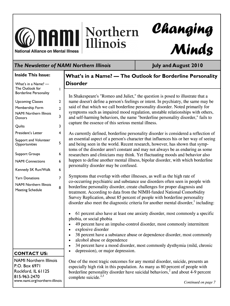 The newsletter of NAMI Northern Illinois, providing information on mental health topics, upcoming events, classes, support opportunities, and community engagement related to mental illnesses.