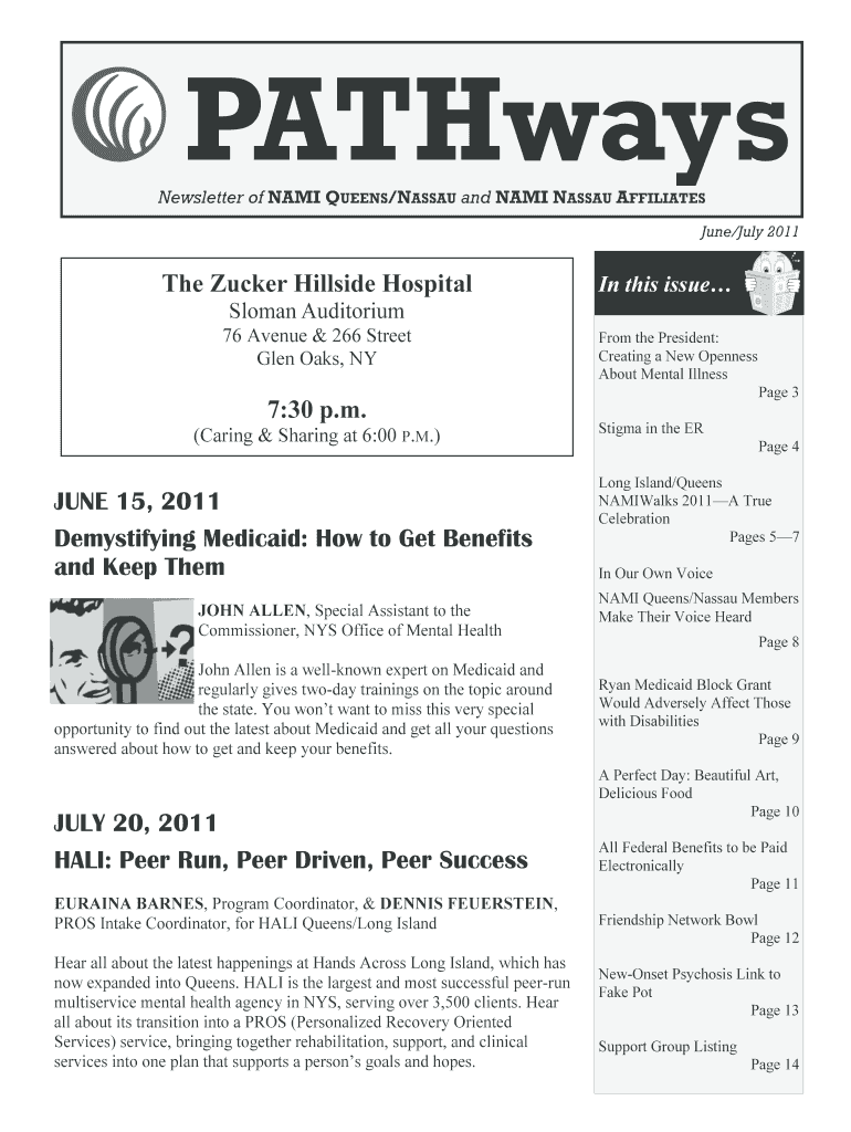 This newsletter provides updates, information, and resources related to mental health services, advocacy, and community support for individuals affected by mental illness in the Queens/Nassau area.
