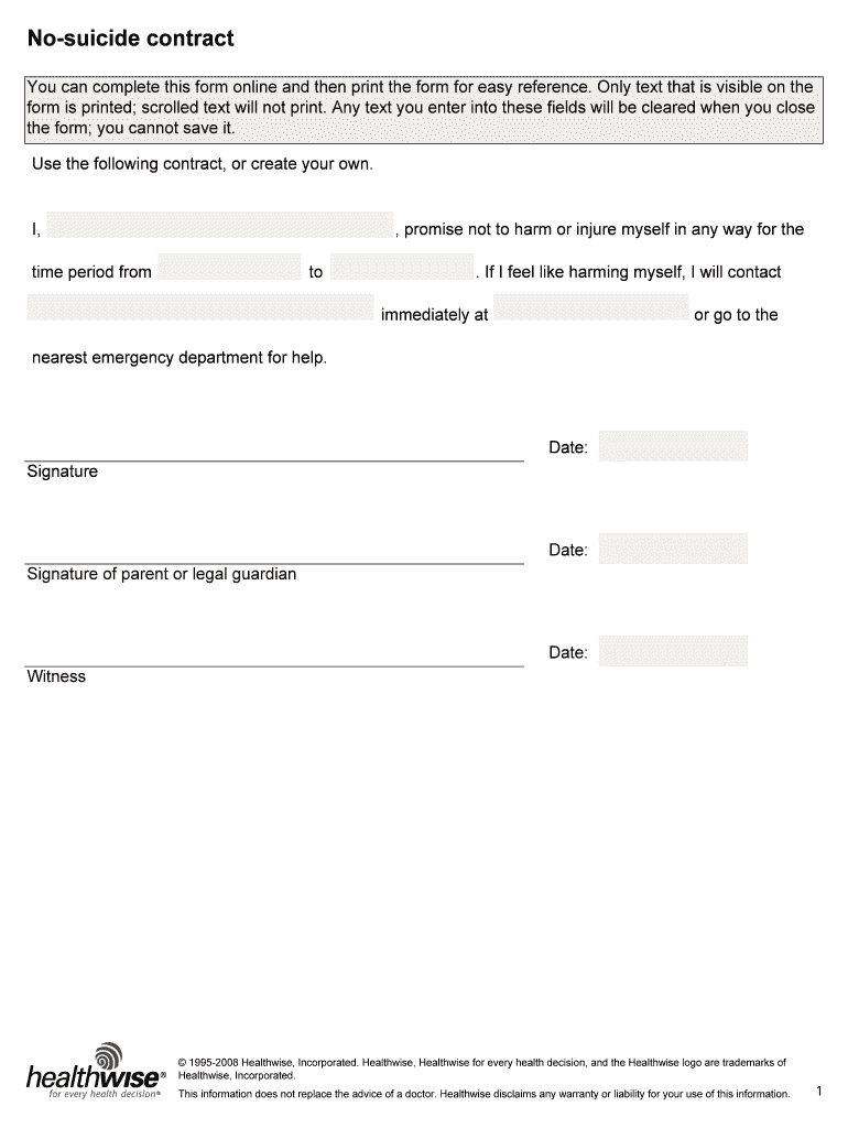 No-suicide contract You can complete this form online and then print the form for easy reference. Only text that is visible on the form is printed; scrolled text will not print. Any text you enter