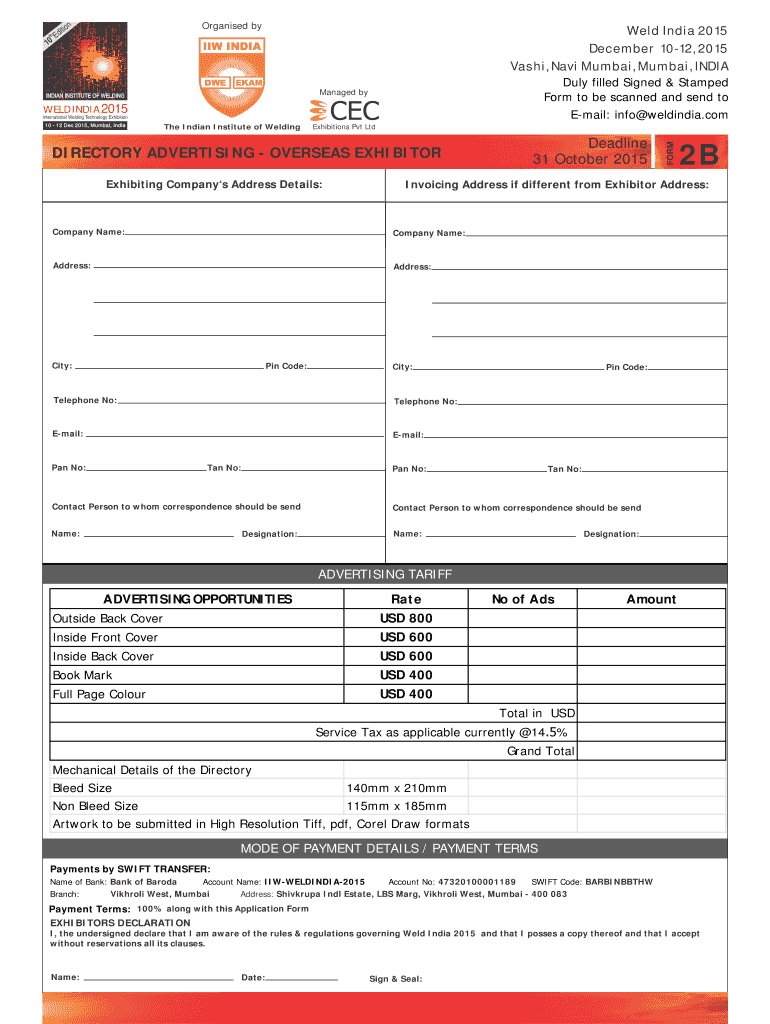 Organized by ITIL Ed Weld India 2015 December 10-12, 2015 Vashti, Navi Mumbai, Mumbai, INDIA Duly filled Signed & Stamped Form to be scanned and send to E-mail: info weldindia.com Managed by INDIAN