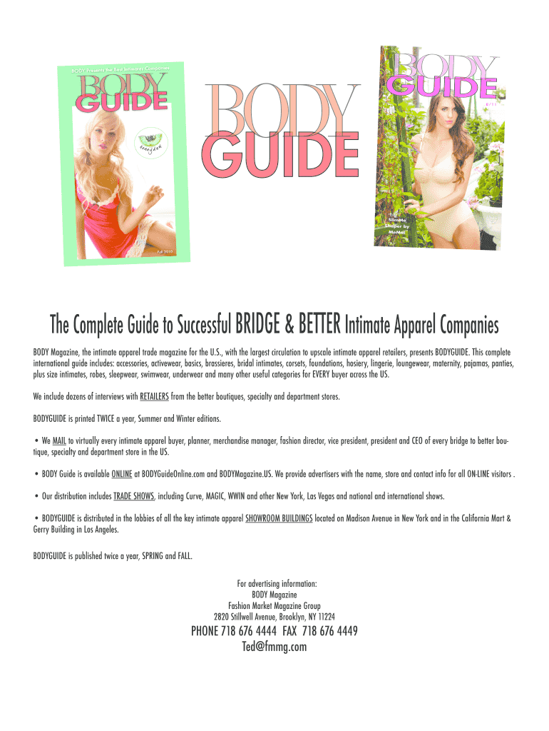 GUIDE 8/11 GUIDE Slime Shaper by Memoir The Complete Guide to Successful BRIDGE & BETTER Intimate Apparel Companies BODY Magazine, the intimate apparel trade magazine for the U.S., with the largest