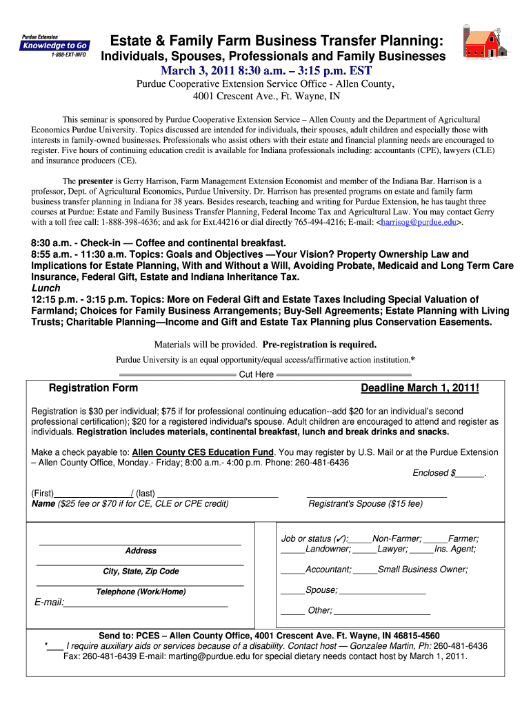 This document is a registration form for a seminar on estate and family farm business transfer planning, detailing the topics covered, the dates, location, costs, and requirements for participants.